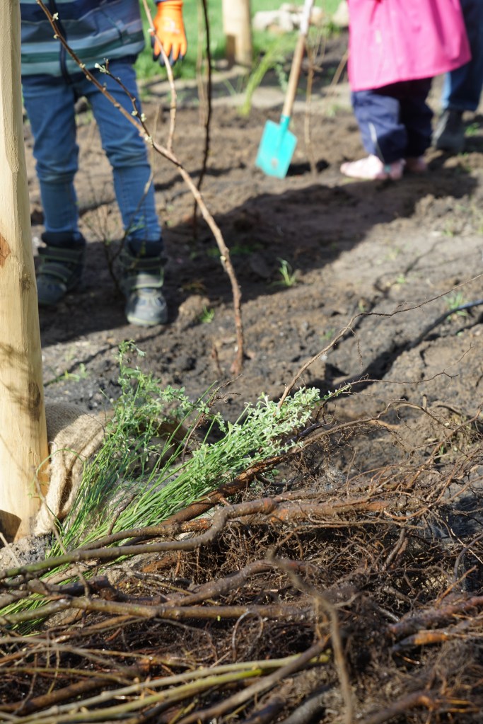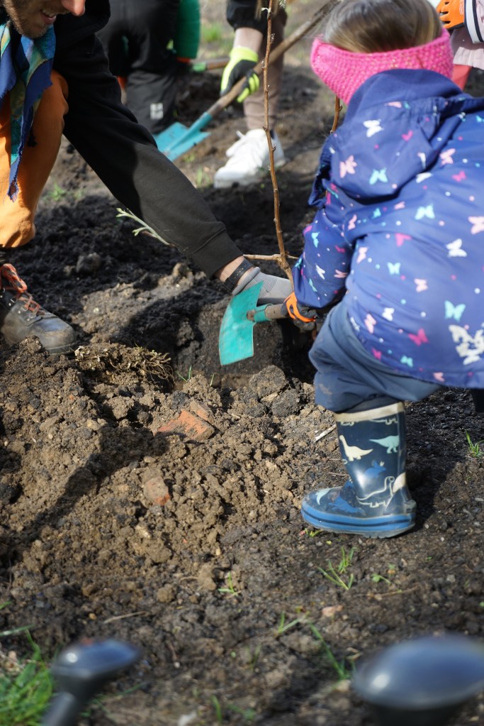 Anfang April 2024 haben Kinder aus der benachbarten Fröbel Kindertagesstätte Schatzinsel gemeinsam mit Mitgliedern der Nachbarschaft den ‚Gertraudenhain‘ angelegt.